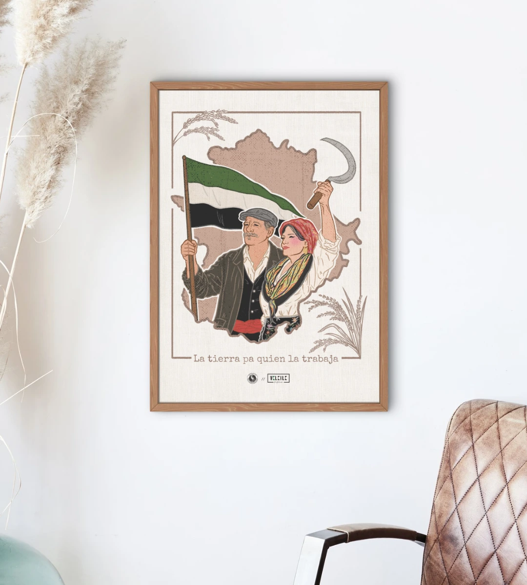 Para conmemorar este hito de nuestra historia, hemos tenido el honor de colaborar con la ilustradora extremeña Veleile. En esta pieza exclusiva, la silueta de nuestra tierra abraza a quienes la cuidan: una mujer que alza la hoz con la determinación de siglos y un hombre que sostiene con orgullo la bandera que nos une. Enmarcados por el trigo que brota de nuestras dehesas, esta lámina es un homenaje a la frase que marcó un antes y un después: «La tierra pa quien la trabaja».