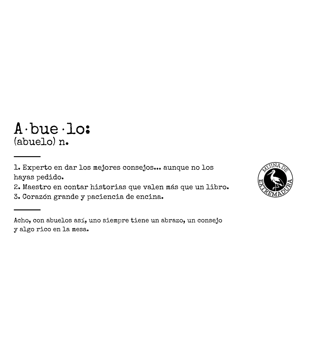 Para los que guardan las mejores historias y no pierden la identidad ni repartiendo mimos. Esta colección es un homenaje a todos los abuelos y abuelas que cuidan de nuestras raíces con una paciencia que no se acaba, desde la puerta de casa al fresco hasta el rincón más querido del pueblo. Un diseño que mezcla el amor por la familia con ese espíritu extremeño que nos hace únicos.