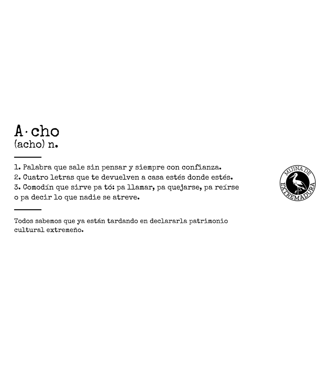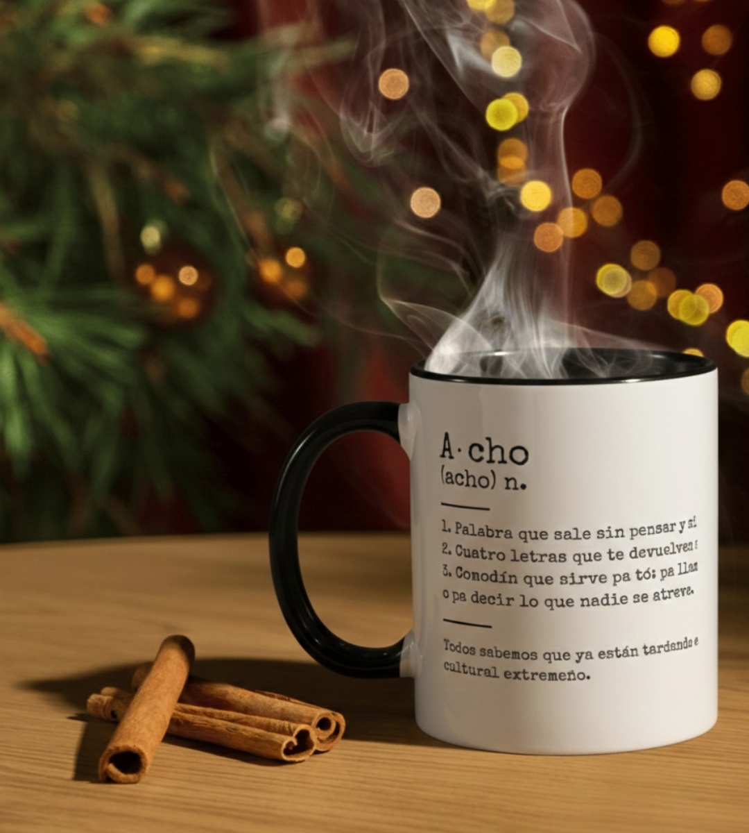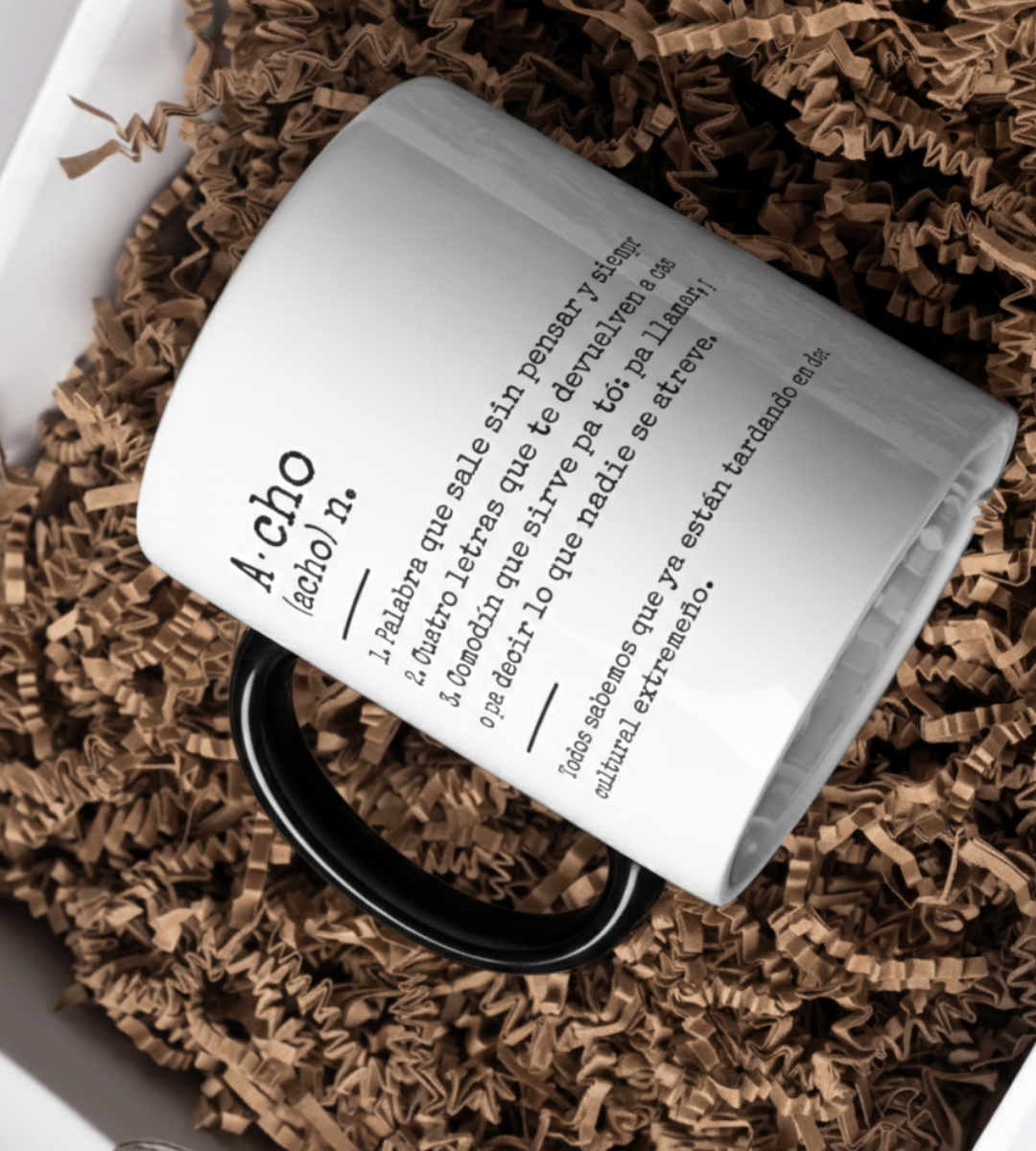 Para los que saben que un «Acho» sirve para saludar, para quejarse, para sorprenderse o para llamar la atención. Esta taza es un homenaje a nuestra palabra comodín, la que nos identifica en cualquier parte del mundo. Un diseño con humor, identidad y ese orgullo extremeño que nos acompaña desde el primer café del día.