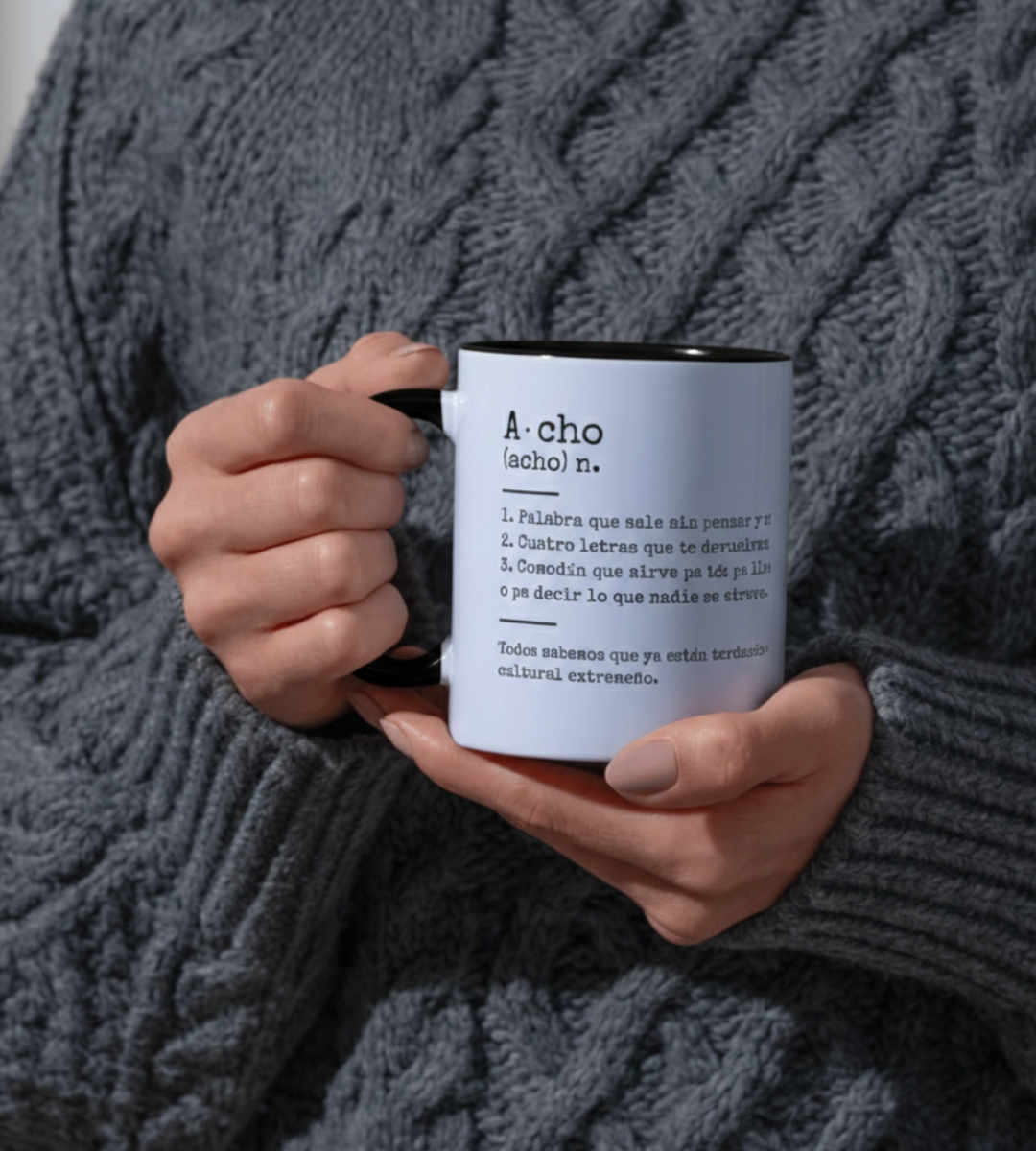Taza Acho: orgullo de acento y desayuno con carácter. Cerámica de alta calidad, 350 ml, exterior blanco con interior y asa negros. Apta microondas; no recomendable lavavajillas para conservar la impresión. Diseño con frases y guiños locales. Envío 3-5 días hábiles; gastos 4,50 € (gratis ≥ 50 €). Una pieza cercana para regalar o autorregalar.